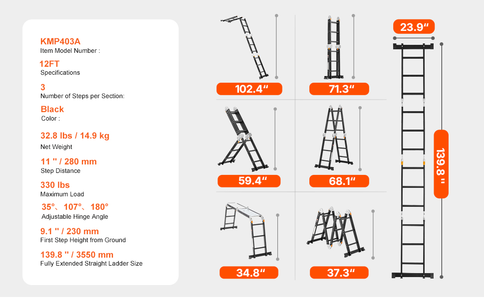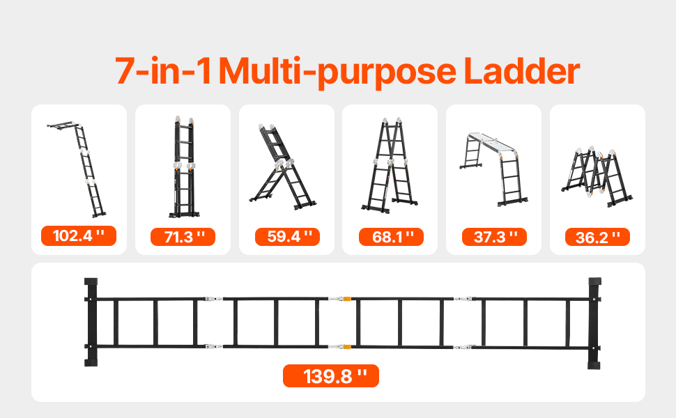 7-in-1 Versatility: This adjustable ladder can be folded into 7 shapes: A-frame, M-frame, ladder, L-shape, platform, folded, and straight. It is ideal for house cleaning, maintenance, home renovation, gardening, car washing, and more. It extends up to 139.8 inches, making it easy to reach rooftops. Additionally, it comes with two scaffolding platforms (34.1" x 23") for added safety and versatility during use.