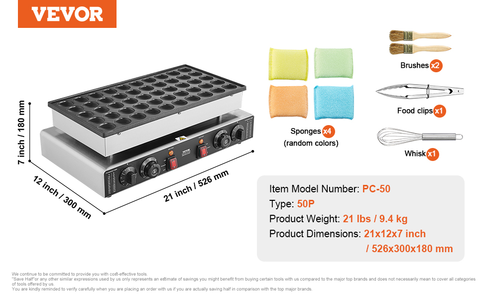 Quickly Make Delicious Pancakes: Our 1700W high-power dutch pancake maker can independently produce 50 delicious mini waffles (approximately Ø43mm) at a time, crispy on the outside and fluffy on the inside, saving you time and providing an effortless breakfast. Evenly distributed heating elements ensure your waffles are uniformly baked. Get ready to enjoy delicious waffles filled with your favorite toppings.
