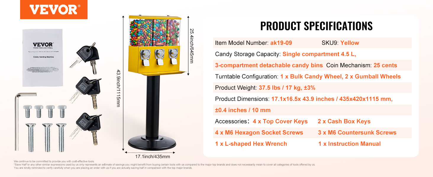 4-Compartment Large Capacity Jar: This commercial candy vending machine with a stand features 4 independent jars that can be rotated 360°, each capable of holding up to 8 lbs of loose candy or 320 1" round candies/bouncy balls, achieving true automatic vending. The candy jar chute comes pre-installed with two round candy wheels and two loose candy wheels, allowing control of candy dispensing and matching candy sizes. Even 0.9" - 1.3" bubble gums/mini capsule toys/bouncy balls can easily pass through the round candy wheel.