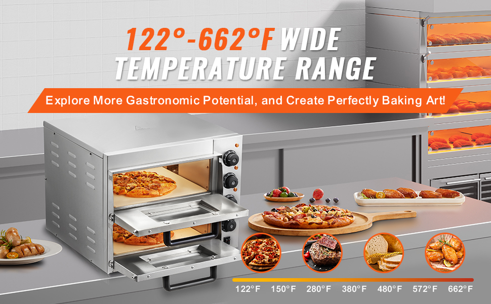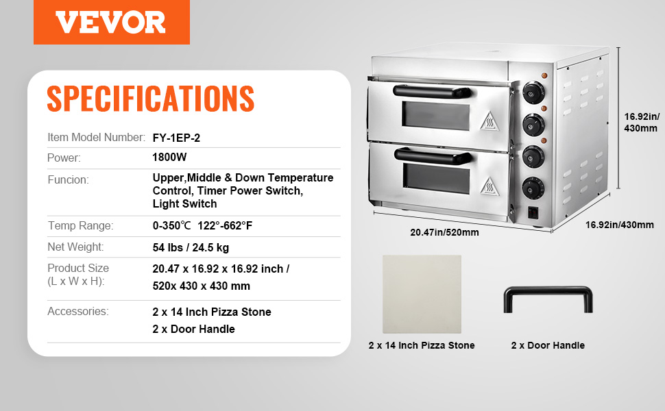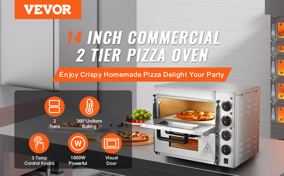 High Quality Electric Pizza Oven: Crafted with food-grade stainless steel, VEVOR electric pizza oven assures you a secure and hassle-free baking experience. Coupled with the provided pizza stone and door handle, this countertop pizza oven is able to bake crispy pizzas up to 14 inches, perfect for your kitchen, dorm, camping, and parties.