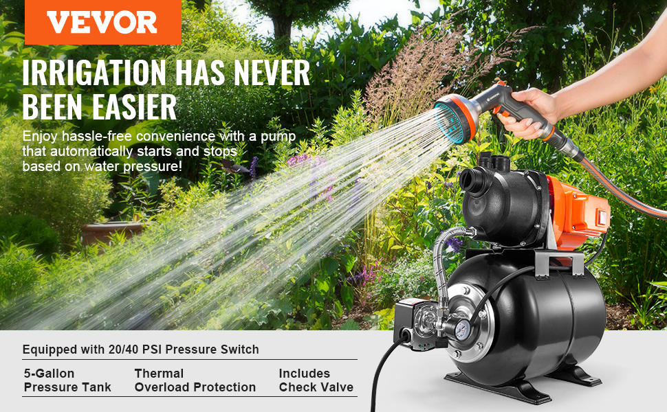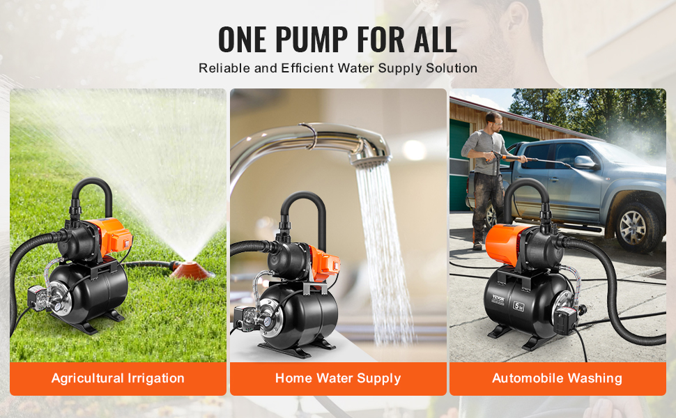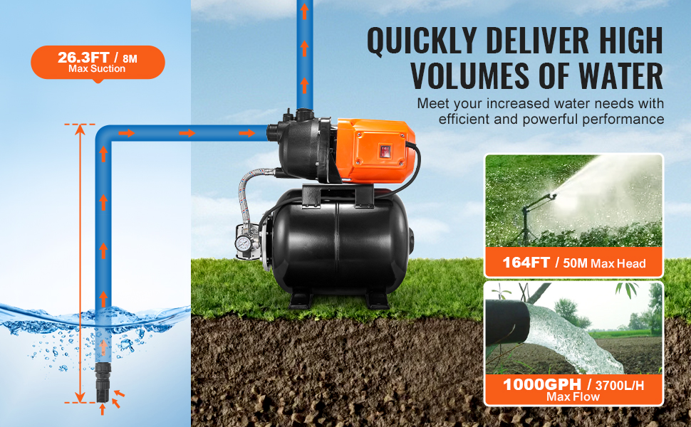 High-Efficiency Water Transfer: Equipped with a 1.0 HP (750W) motor, our shallow well pump with pressure tank delivers a maximum flow rate of 1000 GPH (3700 L/H), a head lift of up to 164 FT (50 M), and a suction depth of 26.3 FT (8 M). Ideal for long-distance water delivery with impressive efficiency.