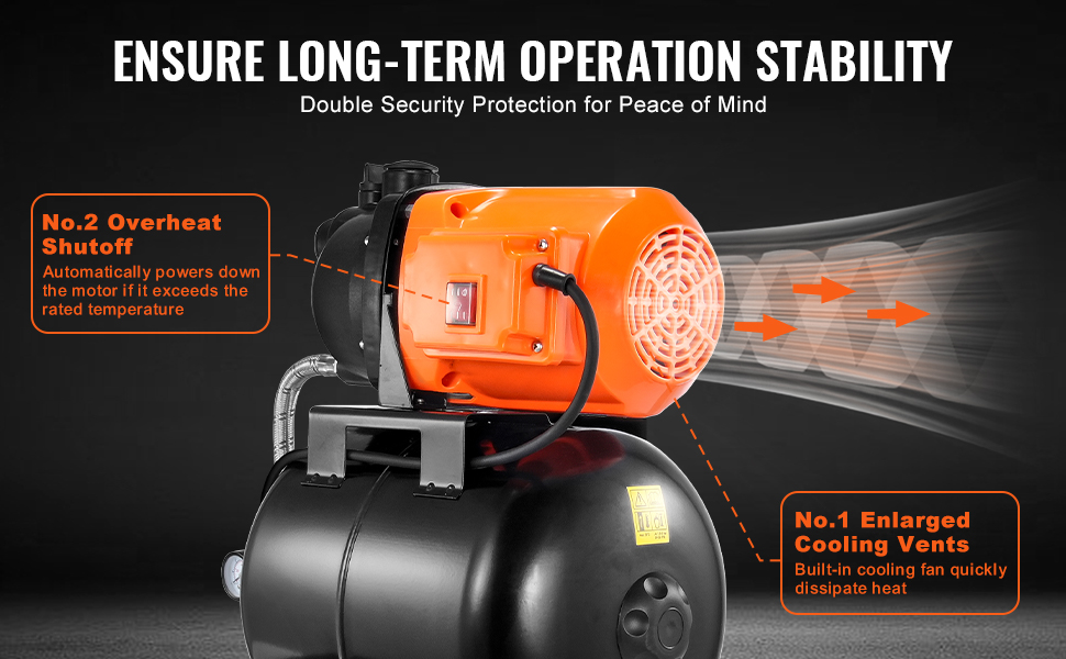 Enhanced Protection for Peace of Mind: Our pump includes built-in thermal overload protection that automatically shuts down the motor if temperatures exceed safe levels, preventing damage from overheating. Additionally, a rear-mounted fan and large cooling vents provide effective heat dissipation to keep the pump running smoothly.