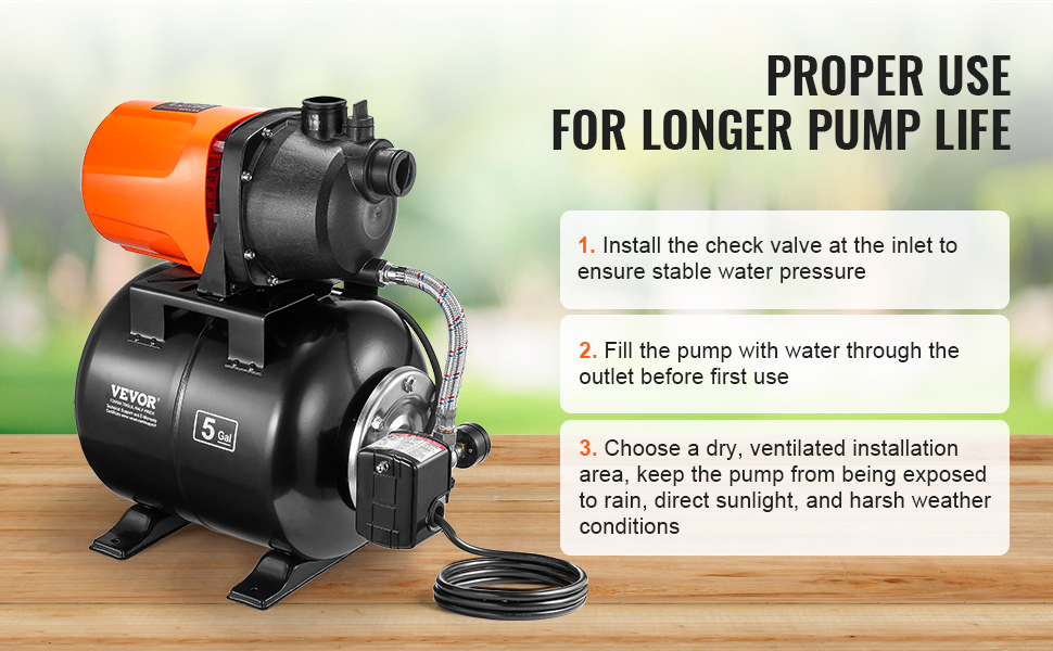 Thoughtful Designed Accessories: To avoid backflow and maintain stable water pressure, we include a check valve with your shallow well pump. This ensures a hassle-free setup—simply connect your hoses and start using your pump right away. (Note: For first-time use, make sure to fill the pump with water through the discharge port to avoid damage from running dry.)
