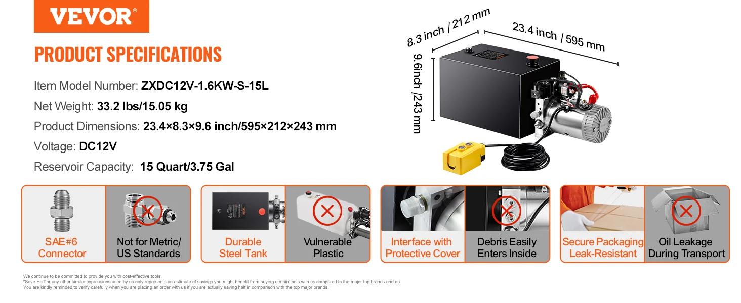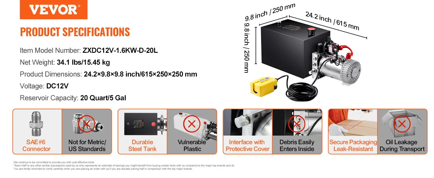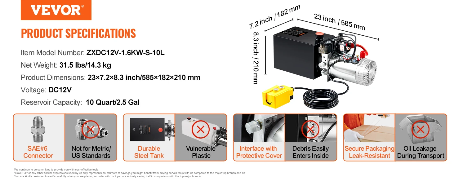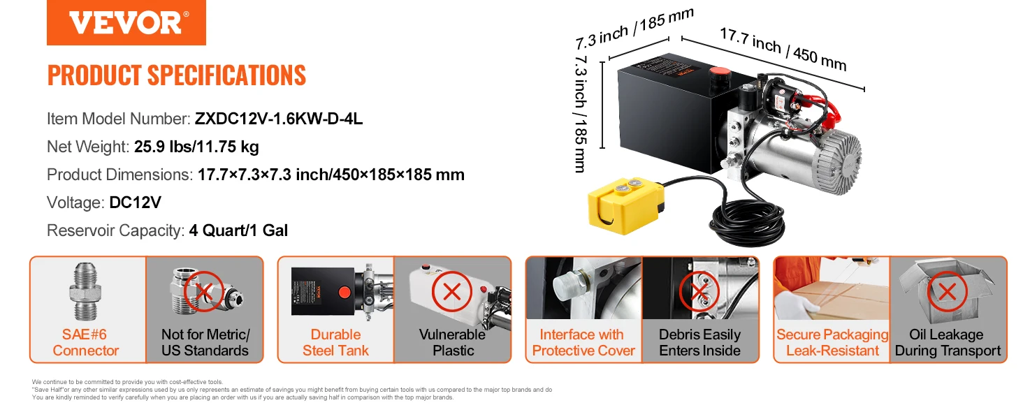 Hassle-free Setup: The 12V hydraulic pump arrives pre-assembled. Add hydraulic oil and connect the power supply and tubing, and you're ready to start. VEVOR hydraulic pump includes an SAE#6 connector, making it compatible with metric and American interfaces for your convenience.