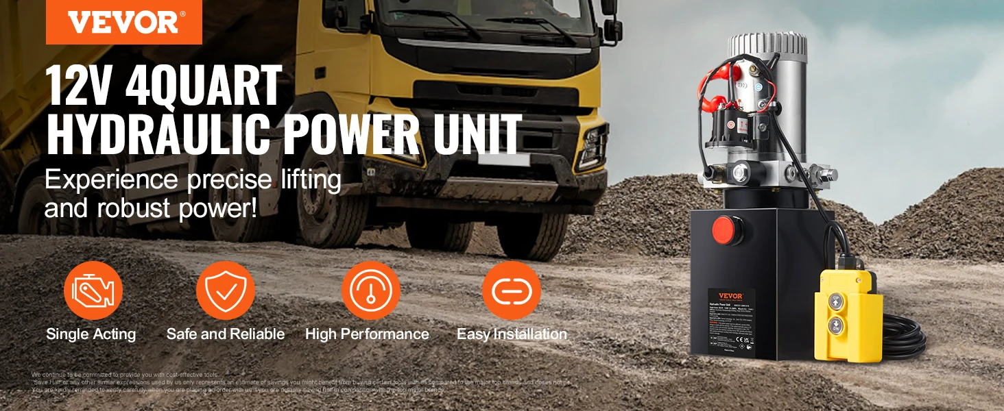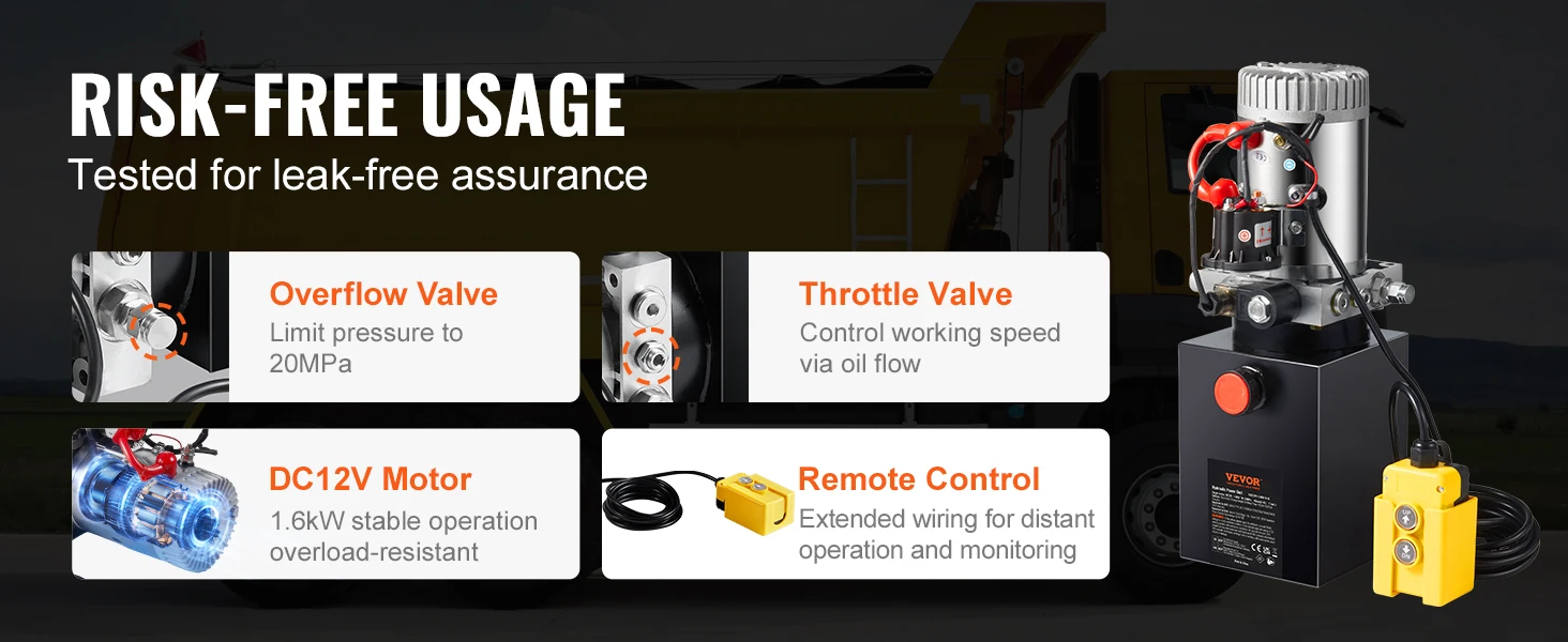 High-Powered Performance: Our hydraulic pump adopts a 12V, 1.6kW DC motor, delivering a high flow rate of up to 0.91GPM. With a 4-quart tank and 16-20Mpa oil pressure, this powerhouse releases a maximum pressure of 3200 psi; the dump trailer pump can effortlessly handle heavy vehicles and machinery, lifting them with ease. Experience the power!