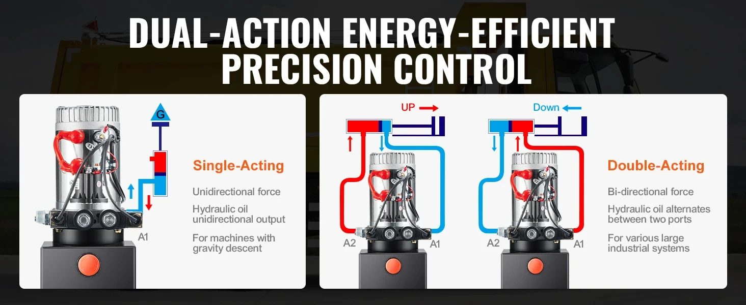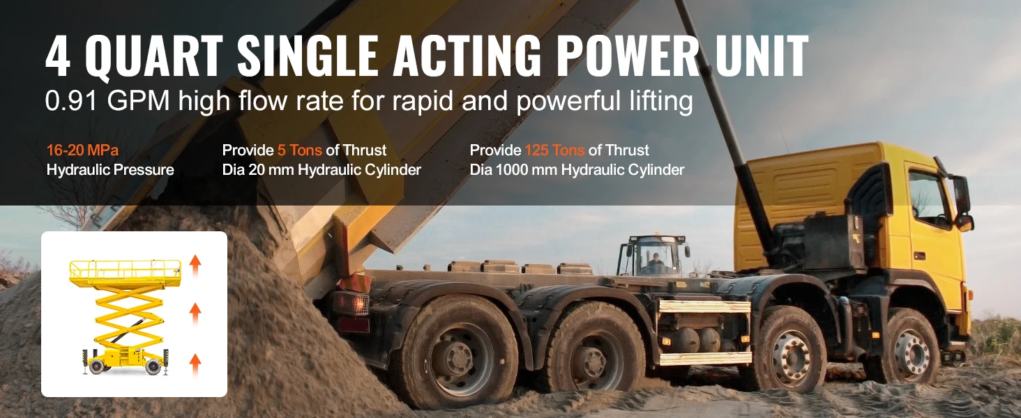 Versatile Applications: This single-acting hydraulic pump isn't limited to one task. It's a versatile workhorse, suitable for various lifting and stamping applications. From dump trailers and container truck tailplates to hydraulic wood splitters, small presses, lifting platforms, semi-electric push trucks, bucket transporters, and more.