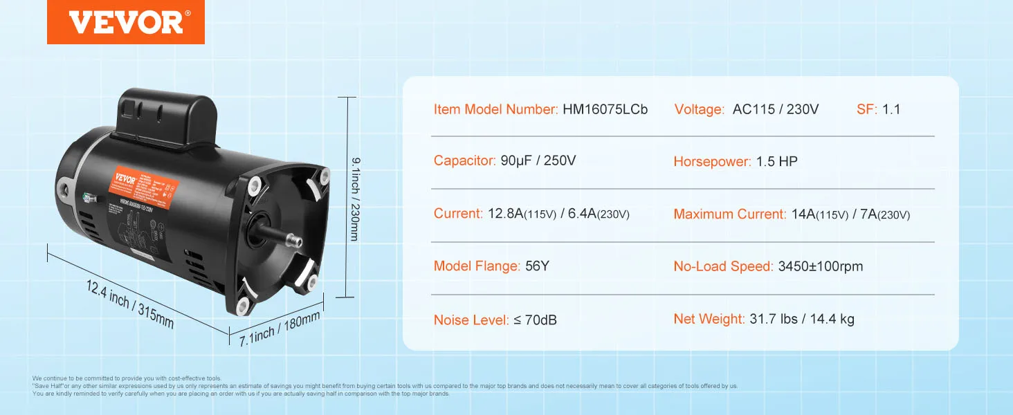 Reliable Performance: 0.75HP pool pump motor runs at 3450RPM high speed, delivering high-efficiency water circulation and a refreshing pool pump system. Voltage - AC 115/230V; Amps: 8/4A ; Amps (Max Load): 10/5A ; SF: 1.5 ; Capacitor: 80μF/250V ; Model Flange: 56J.