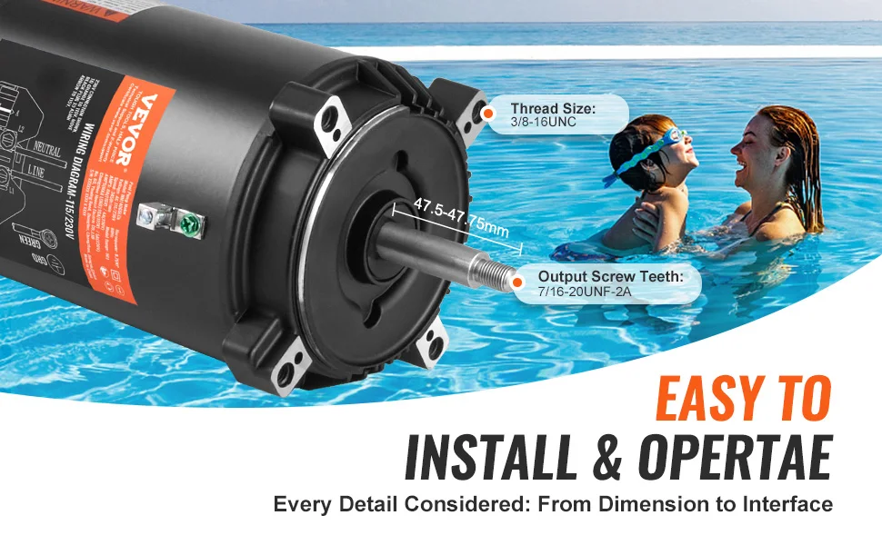 Easy Installation: Installing our swimming pool pump motor is a breeze with a thread size of 3/8-16UNC, output screw teeth of 7/16-20UNF-2A, and a 1.9-inch shaft extension. Get detailed installation instructions with the included user manual.