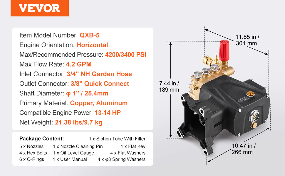 • High-Efficiency Cleaning Power: Our pressure washer pump delivers up to 4200 PSI of powerful water pressure with a maximum flow rate of 4.2 GPM, ensuring fast completion of tasks ranging from household cleaning to light industrial jobs. (Recommended working pressure: 3400 PSI for typical residential and light industrial cleaning and to extend pump life.)