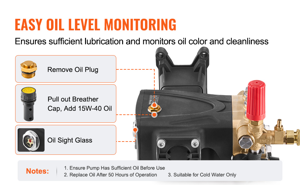 • Easy Maintenance: An integrated oil sight glass lets you check oil levels without disassembling the unit, helping detect low oil or contamination promptly to keep the pump in peak condition. To extend lifespan and ensure continuous efficiency, we recommend changing the oil every 60 hours of operation. Note: This replacement pump for power washer is intended for use with cold water only.