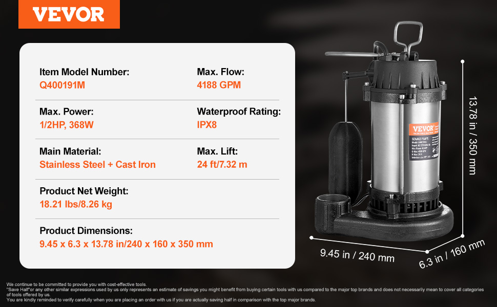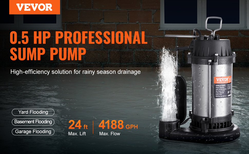 0.5HP 4188GPH——Our sewage pump is powered by a 0.5HP motor, boasting a max flow rate of 4188GPH and a lift capability of 24 ft.