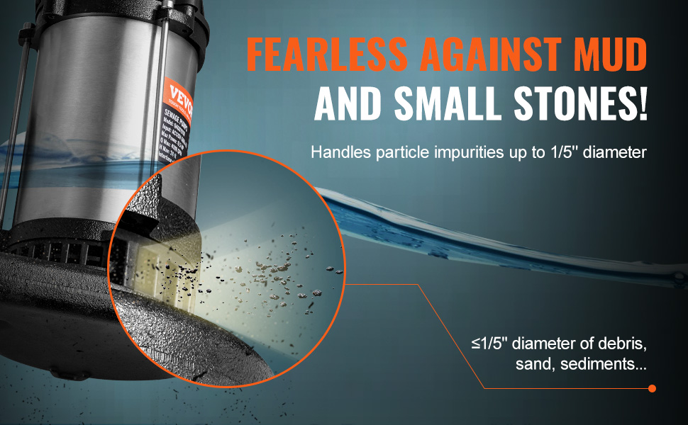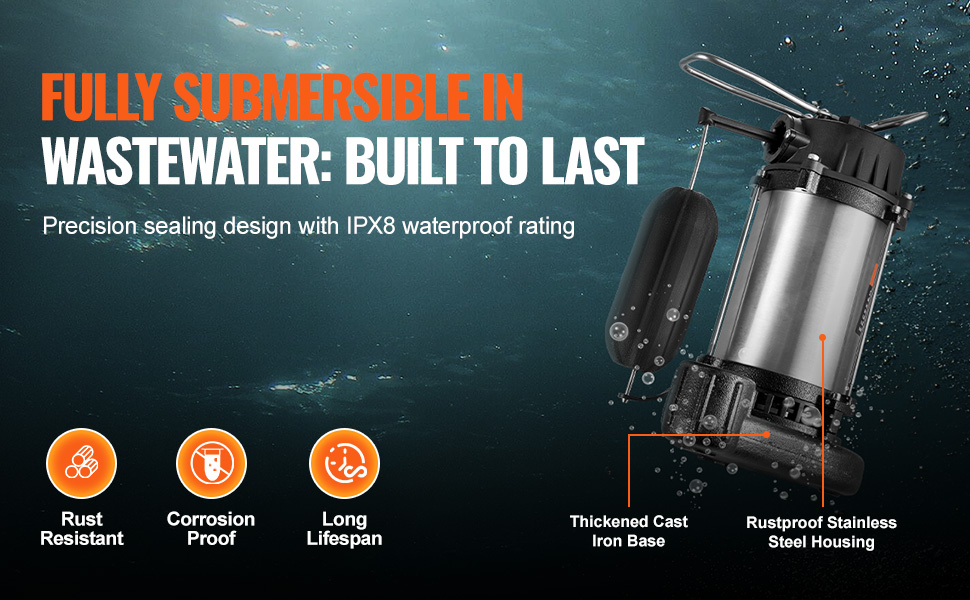【Tough as Nails】: To ensure longevity, we've assembled our submersible sewage pump with a stainless steel body and cast iron housing, both known for their high wear and corrosion resistance. With an IPX8 waterproof rating, it's ready to tackle the tough environments.