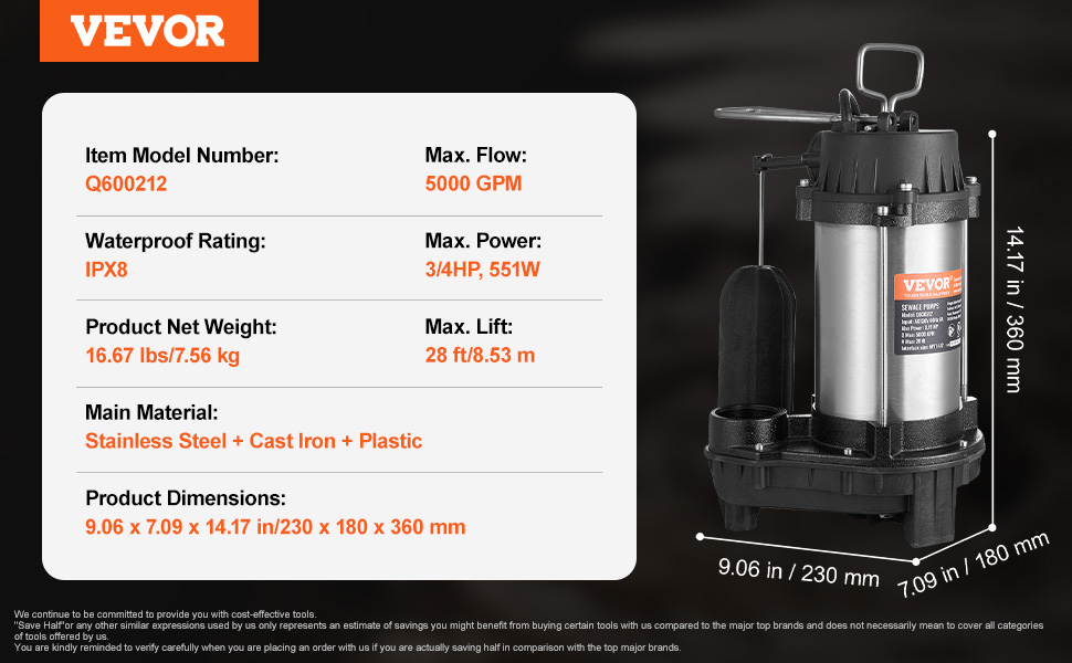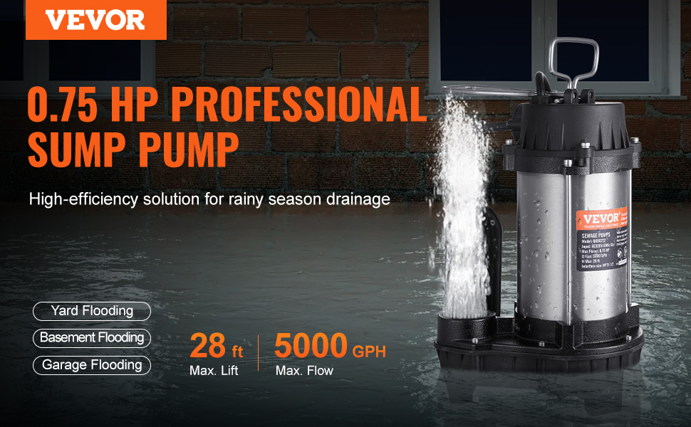0.75HP 5000GPH——Our sewage pump is powered by a 0.75HP motor, boasting a max flow rate of 5000GPH and a lift capability of 28 ft.