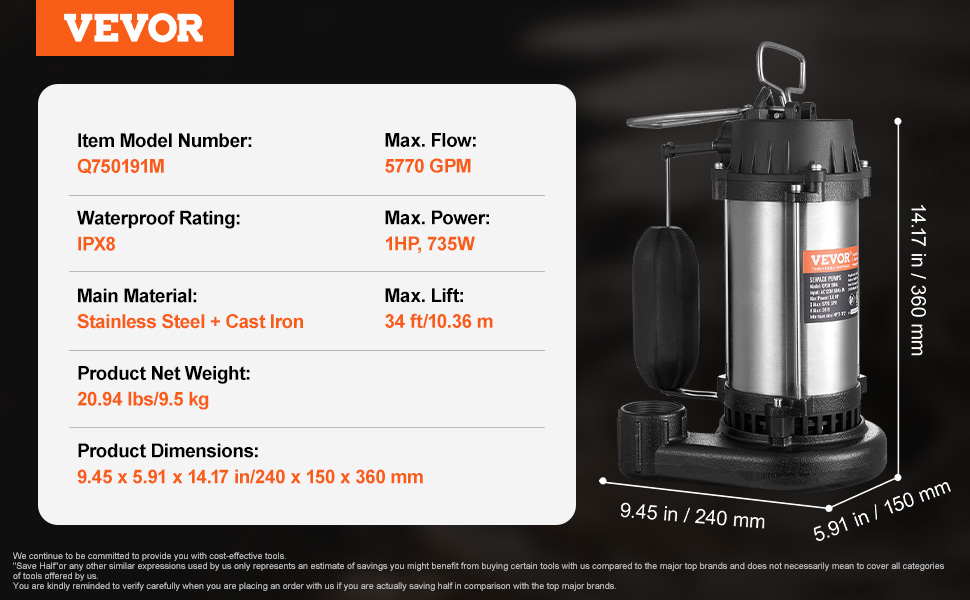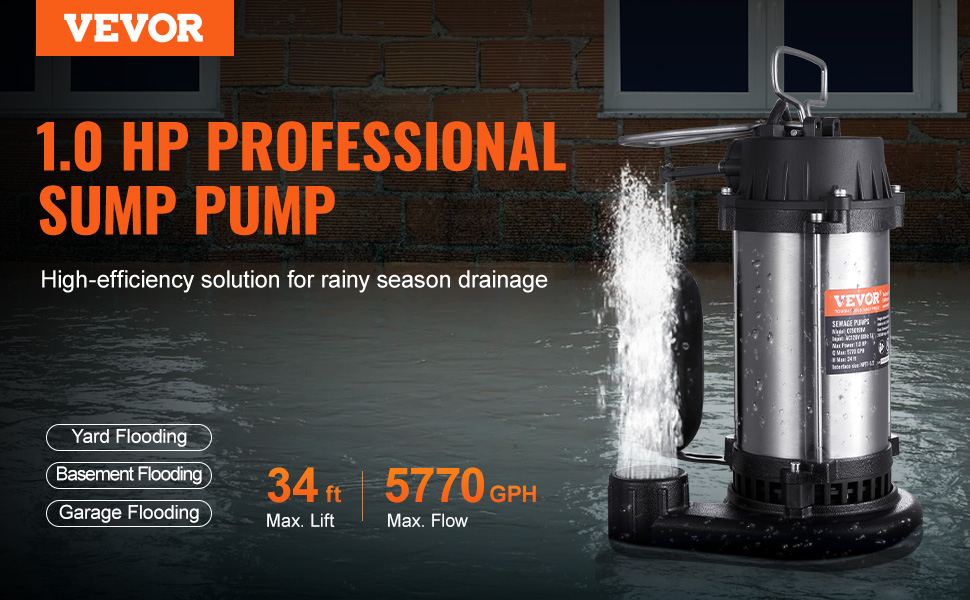 1HP 5770GPH——Our sewage pump is powered by a 1HP motor, boasting a max flow rate of 5770GPH and a lift capability of 34 ft.