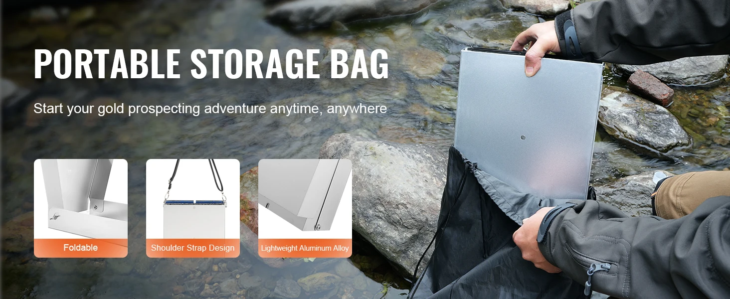 Our gold sluice is foldable and comes with a storage bag and shoulder straps. You can stow all the kit's tools in the storage bag and carry the sluice with the shoulder straps, making it easy to transport to your gold panning site without the need for additional bags or toolboxes.