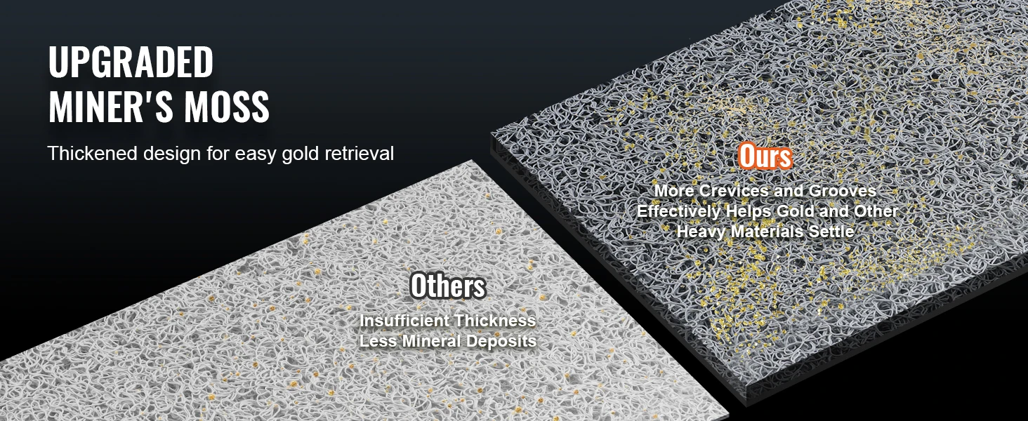 The thickened miner's moss features more crevices and grooves, helping gold particles and other heavy materials settle while washing away lighter sand and impurities. This improves gold panning efficiency and increases your chances of success.