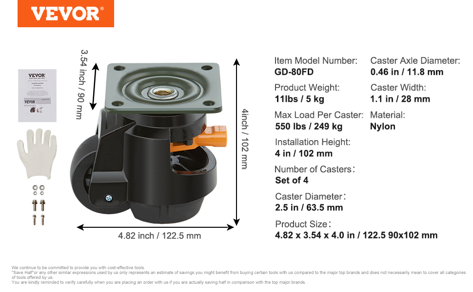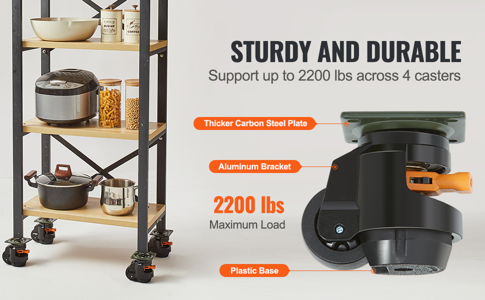 Heavy Lifter Alert: Forget wimpy wheels. Our heavy duty wheels come with a beefy carbon steel plate and a cool aluminum bracket. The retractable non-slip support base further enhances their strength and durability. Hold up to 2200 pounds? You bet!