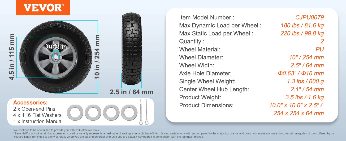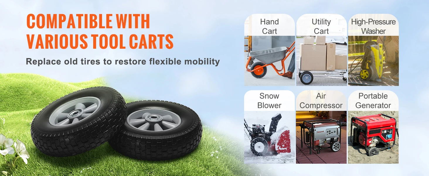 Versatile Compatibility: These 10" tubeless solid tire wheels fit perfectly on hand trucks, dollies, trolleys, wheelbarrows, yard tractors, snow blowers, high-pressure washers, air compressors, and more! It's like giving your equipment an instant upgrade!