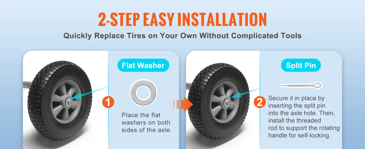 Easy-Peasy Installation: Installing these solid run-flat tire wheels is a breeze! Just install the flat washers and open-end pins on both sides of the axle, tighten them, and you're good to go. Replacing worn-out tires has never been this simple.
