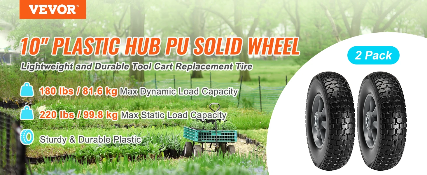 10" Solid PU Wheel: These solid PU wheels with sturdy plastic hubs boast a whopping 180 lbs/81.6 kg dynamic load and a static limit of 220 lbs/99.8 kg. Dual-sealed bearing shafts keep the surface smooth to prevent dust and water. This 2-pack set is perfect for replacing tires on your towing and transport equipment.