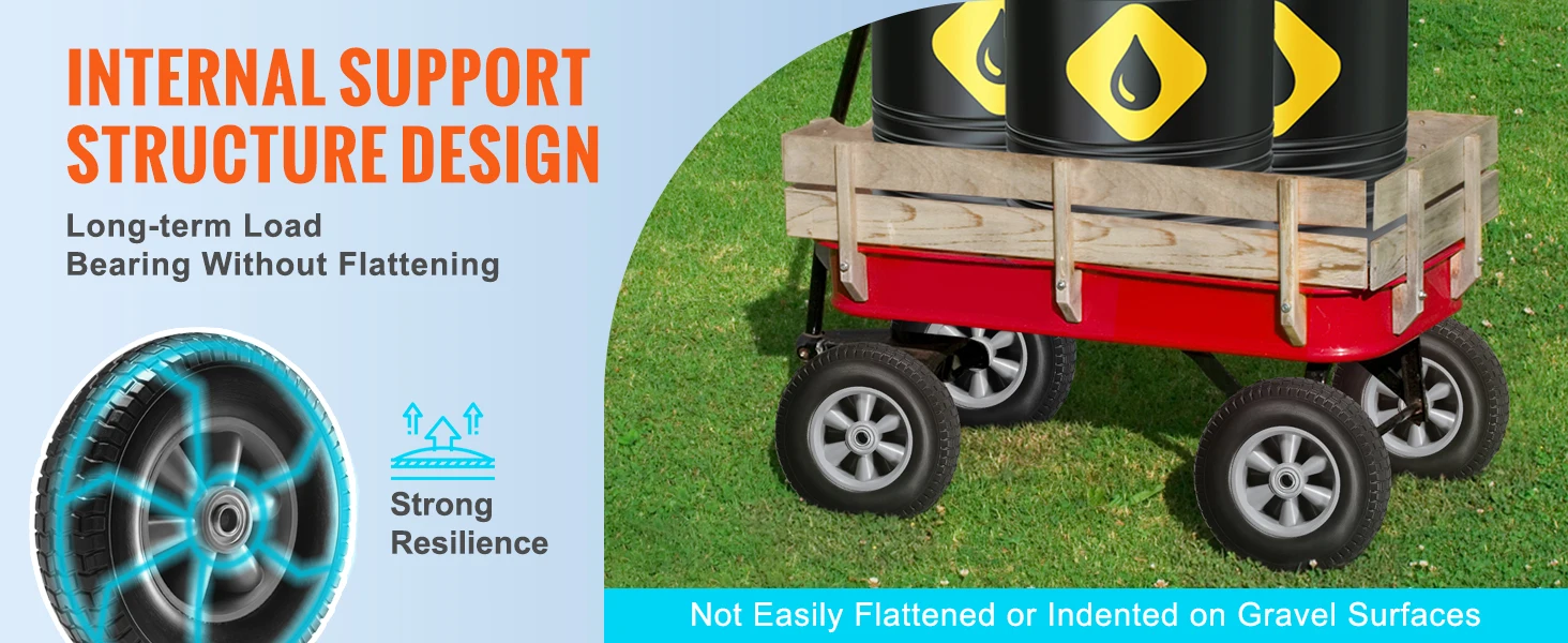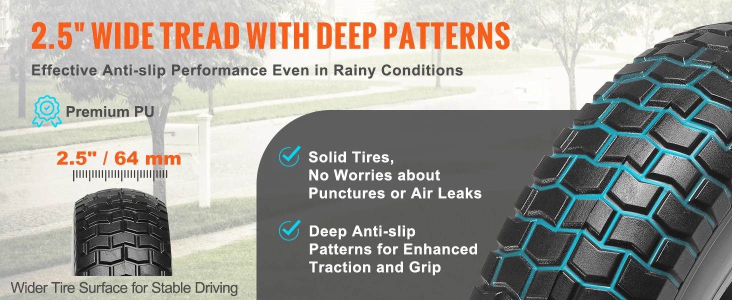 Ultimate Traction: Made from high-rebound PU material with extra-wide 2.5"/64 mm tires and deep tread patterns, these solid wheels grip like a pro. Say goodbye to slipping and sliding, even on those rough, unpredictable terrains. With the solid construction, you don't have to worry about tire punctures or air leaks.