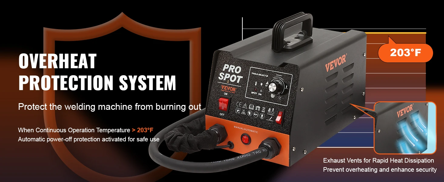 Our spot welding machine is equipped with an intelligent overheat protection system, which activates when the temperature exceeds 203℉/95℃, preventing short circuits and machine damage. Additionally, the side vents ensure rapid heat dissipation, making welding hassle-free and secure.