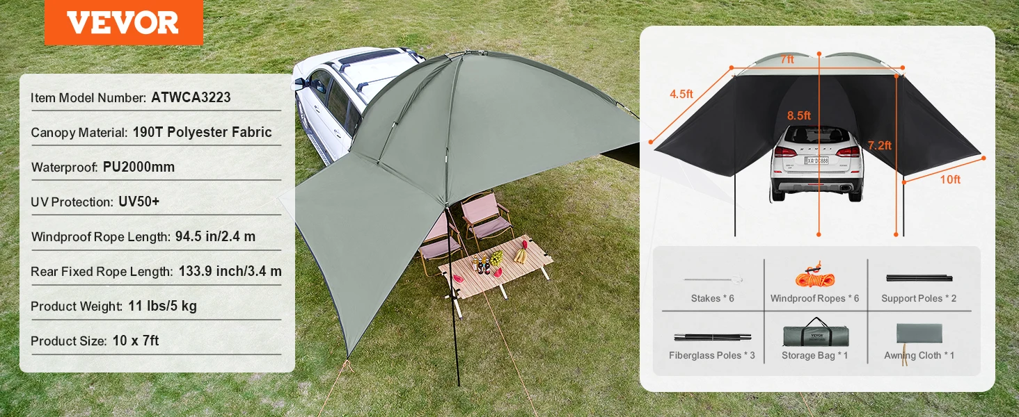 Heavy-Duty & Durable Material: Crafted from 280G polyester fabric with a PU 3000mm coating, the vehicle awning is dense and durable. The rust-proof aluminum alloy support poles with reinforced corners, and rubber connectors are designed for added strength. Thickeded wind-resistant ropes are ready to withstand all weather conditions.