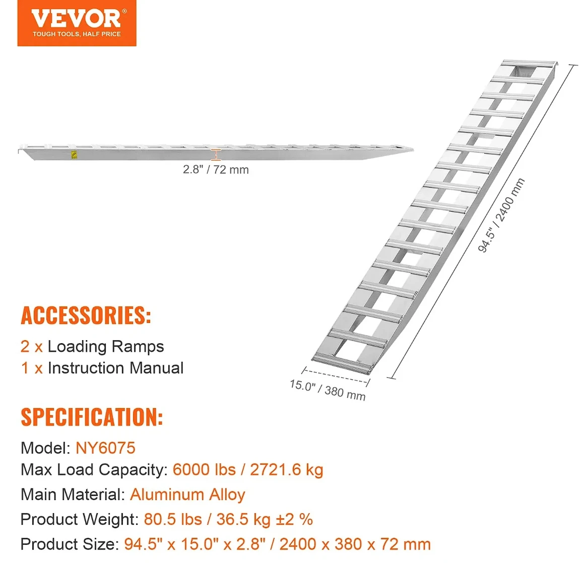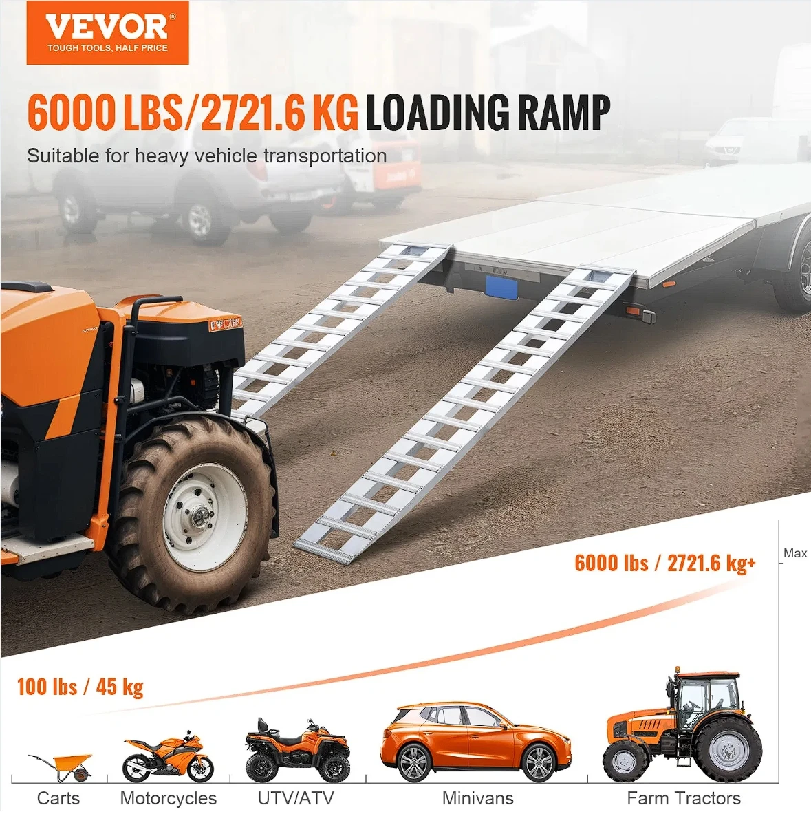 6, 000 lbs Maximum Load Capacity: This extended truck loading ramp has been safety-tested and can support up to (6000 lbs / 2721.6 kg). Transporting agricultural tractors, ATVs/UTVs, lawn mowers, snow blowers, motorcycles, trailers, and cars has never been easier! Each ramp measures 94" x 15", suitable for vehicles or wheeled equipment with tire widths up to 14", and is ideal for users needing a long and gentle incline.