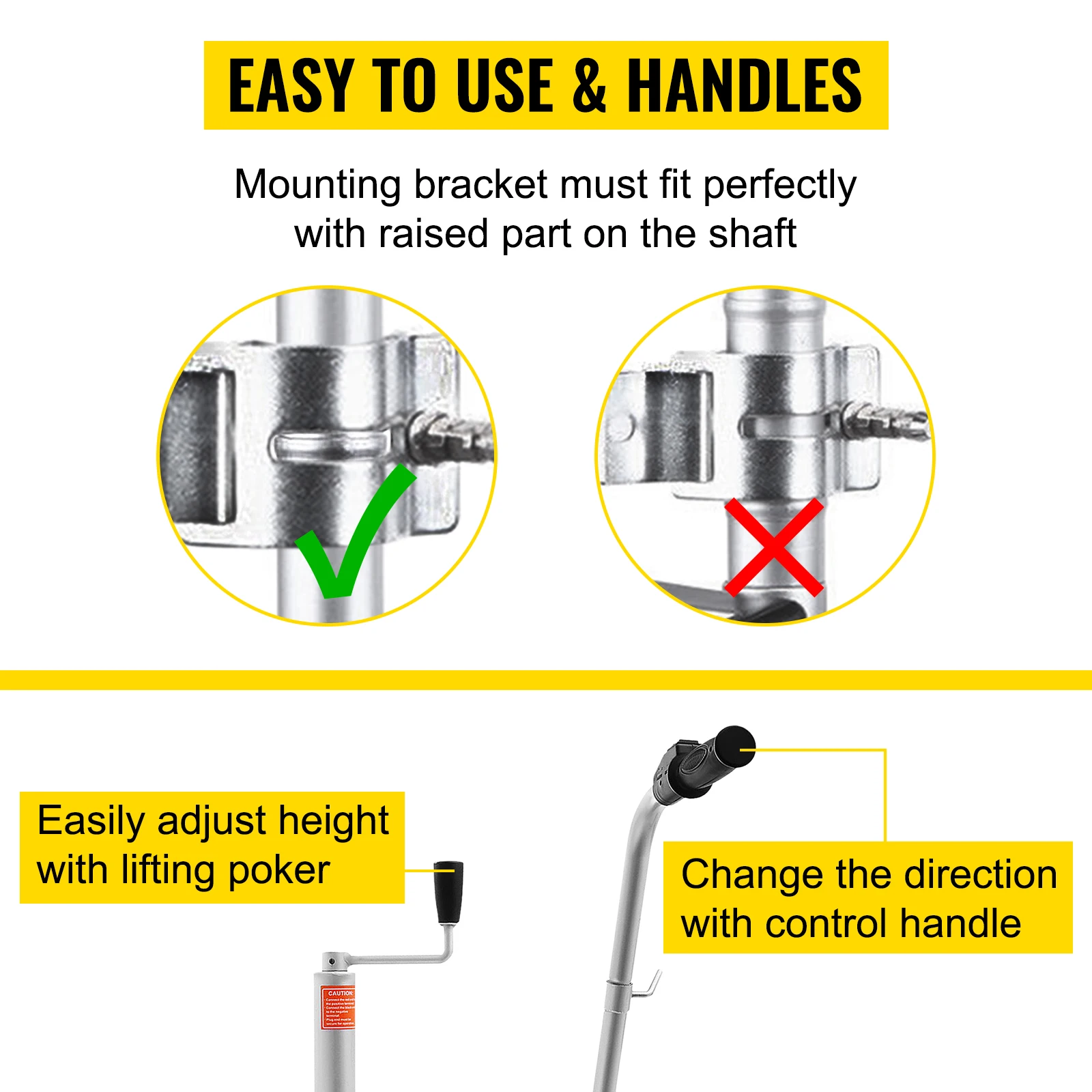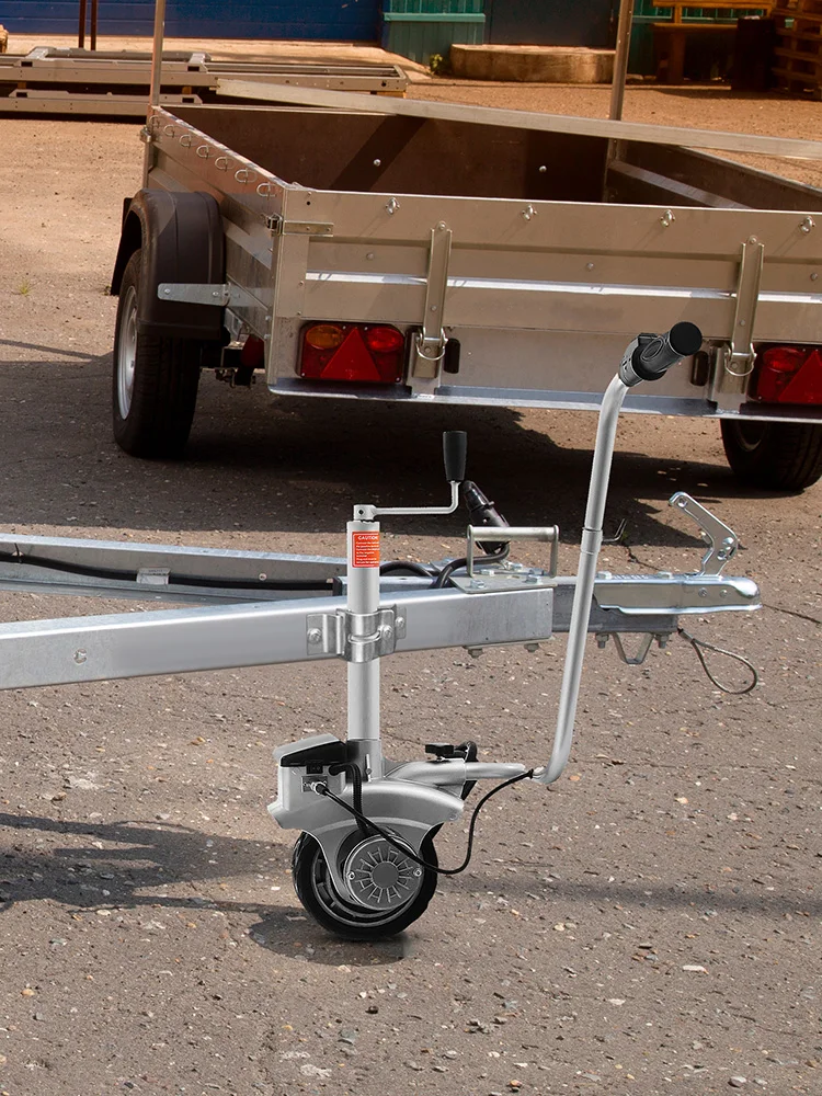 Convenient Operation: The electric trailer dolly is equipped with two control handles. The height of the jockey wheel can be easily controlled by turning the lift handle. The forward and backward movement can be performed at your fingertips. And you should pay attention that the mounting bracket must fit perfectly with a raised part on the shaft, and the product cannot be used on a ramp greater than 5°, dirt and gravel roads.