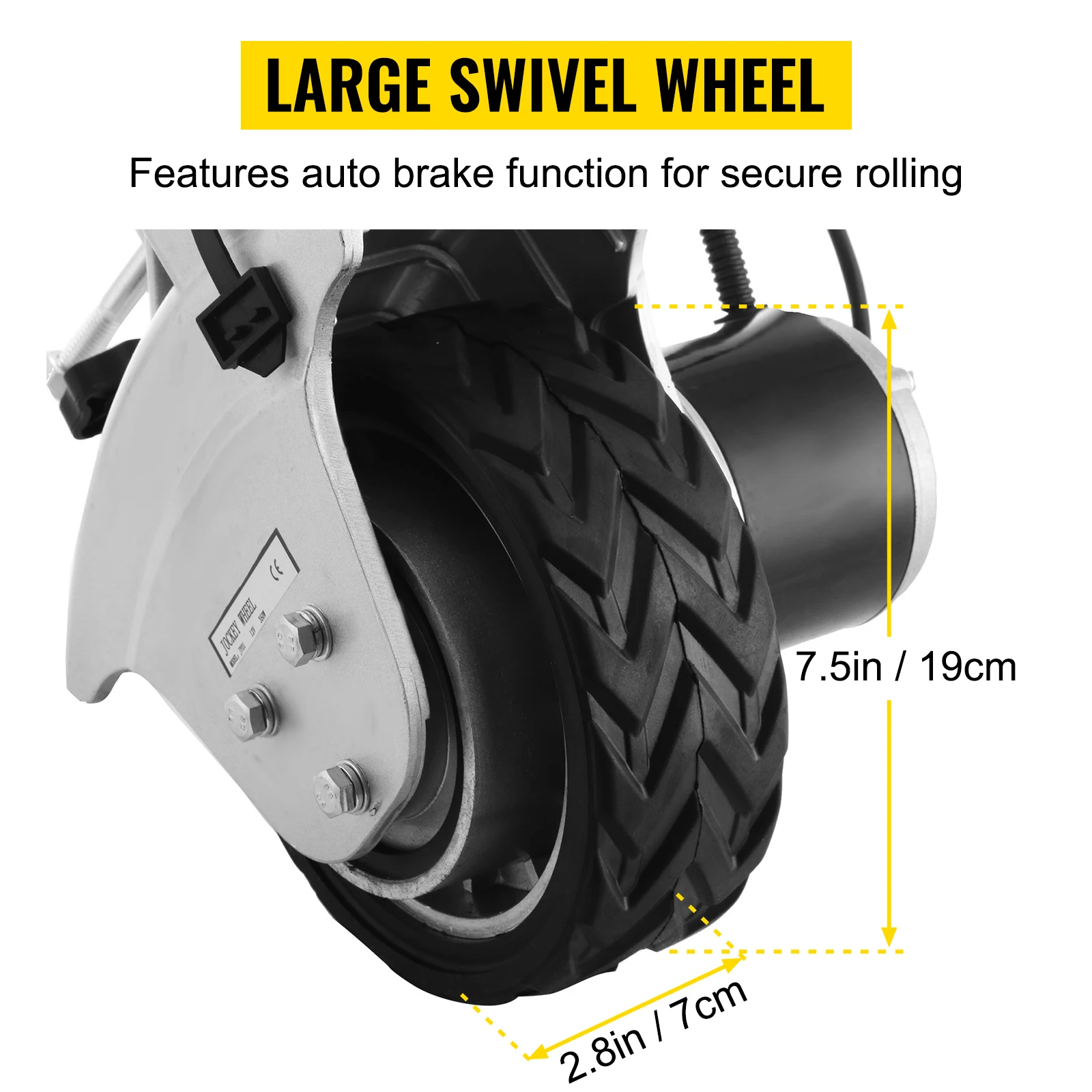 7.5 inches Pneumatic Tires: To allow for optimal torque, the heavy-duty wheel of the motorized trailer dolly has a gear ratio of 326:1. With a width of 2.8-inch and a diameter of 7.5-inch, it ensures excellent traction on any surface, featuring an automatic brake function for reliable security.