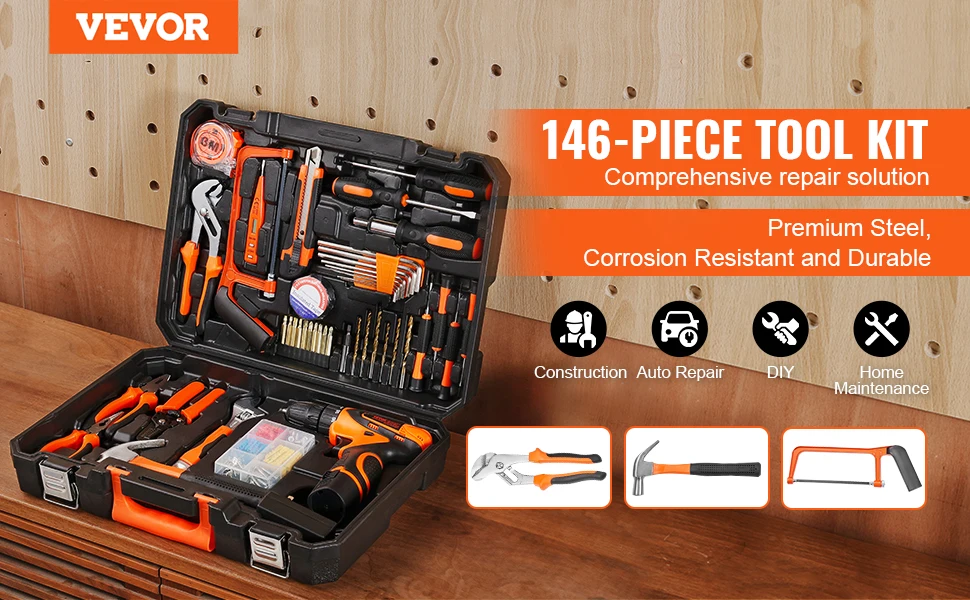 Versatile Tool Set: Our tool kit includes the electric drill, precision screwdriver, adjustable wrench, tape measure, claw hammer, bow saw, and more practical tools to meet all your repair needs. Whether it's home repairs, DIY projects, or car maintenance, the VEVOR household tool kit provides a comprehensive solution for you.