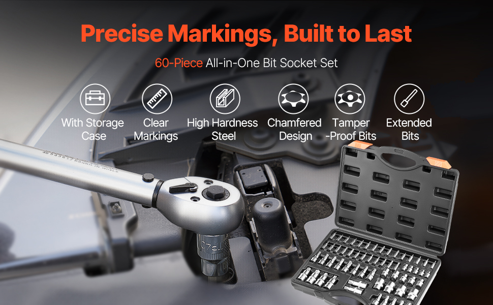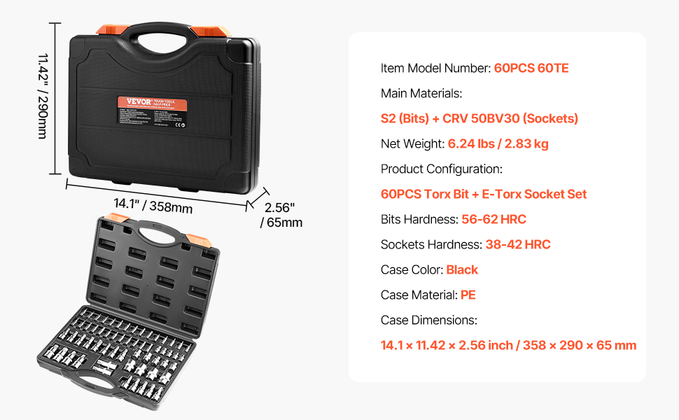 Tamper Proof Design: This 60-piece tamper-proof torx socket set includes 14 E-torx sockets (E4–E24), 17 Torx bit sockets (T6–T70), 17 tamper-resistant Torx bits (TT6–TT70), and 12 Torx Plus bits (TP8–TP60), covering a broad range of secure fastener needs.
