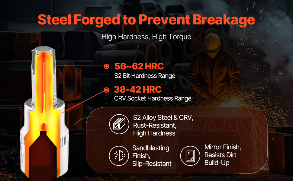 Rustproof & Durable: Constructed from high-hardness S2 alloy steel and CRV chrome-plated steel, the torx bit socket set surfaces feature sandblasting and mirror polishing. This design resists breakage and corrosion, ensuring years of reliable use.