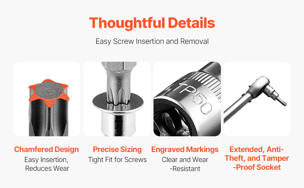 Easy Insertion: The torx bit set features a chamfered edge design with rounded triangular contact points to expand the contact area, ensuring smooth insertion while minimizing fastener wear. Precision-fit dimensions allow for easy alignment and secure threading, making screw insertion or removal effortless.