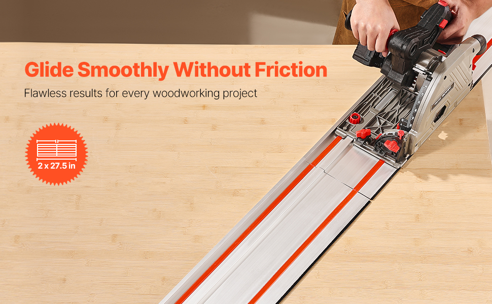 【Advanced Security Features】: This guide rail is designed with low-friction glide strips, chip guard strips, and underside gripping strips. The low-friction strips enable smooth saw movements, reducing drag during cutting. Chip guard strips minimize edge splintering & chipping, while the underside gripping strips keep the track saw steady during cuts
