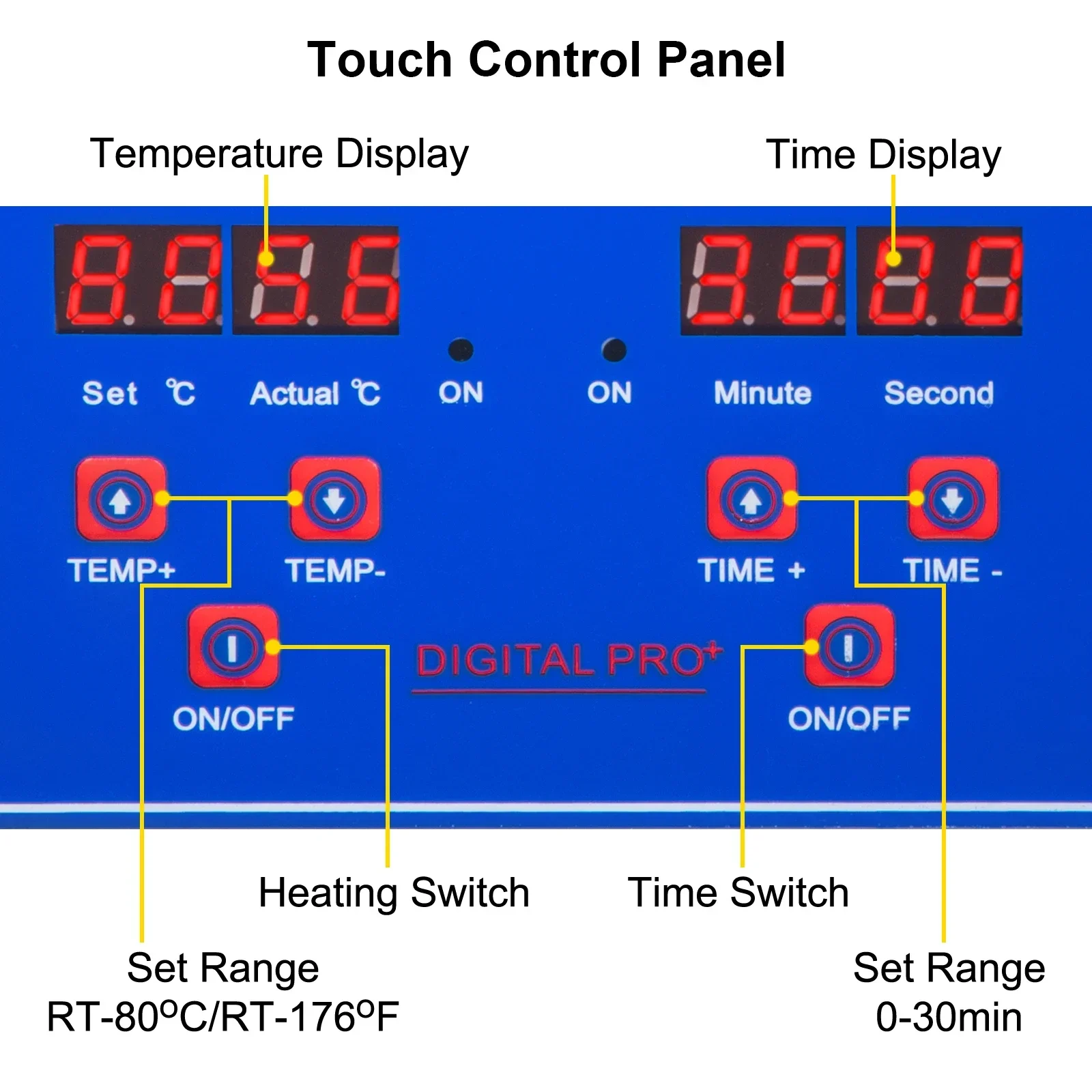 • 【DIGITAL CONTROL PANEL】 - The jewelry cleaner ultrasonic machine features a digital control panel, with an adjustable timer (0-30 min) and heater (RT-176℉/RT-80℃) displayed on LED. A heating function can effectively soften and dissolve oil and wax stains, thereby improving the cleaning effect.