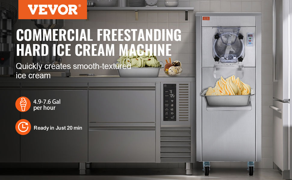 • User-Friendly Operation: This hard-serve ice cream machine features a digital control panel with rich functions, simplifying operation. Set automatic cooling, initiate one-click cleaning, and adjust time settings effortlessly. Monitor production time and remaining quantity at a glance on the intuitive display.