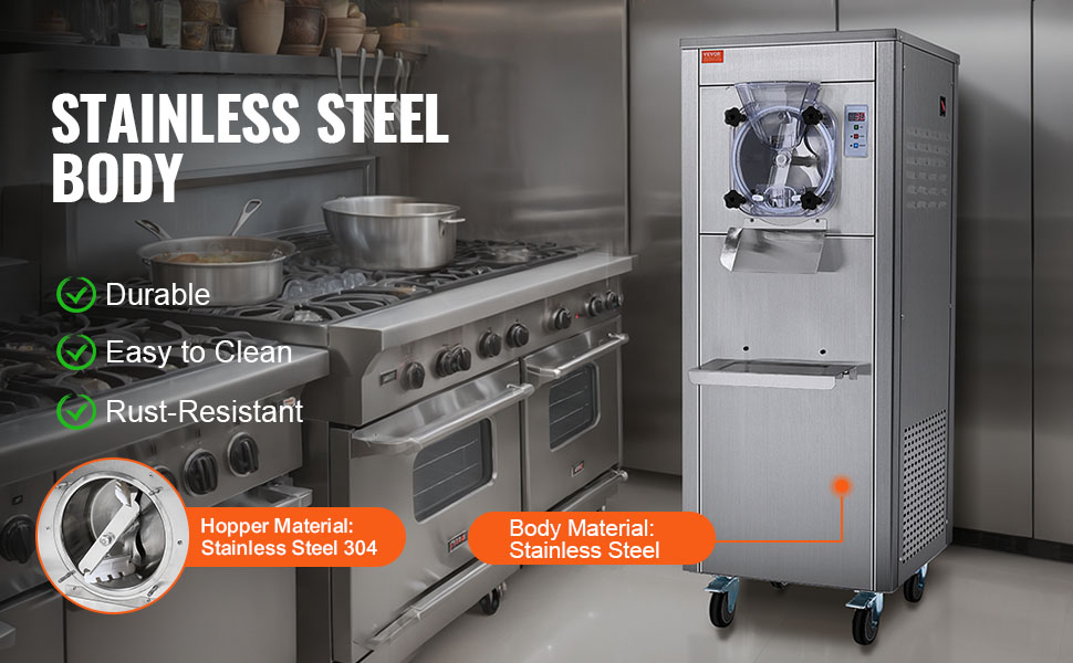 Crafted from high-grade stainless steel with a 304 food-grade stainless steel cylinder, this ice cream machine hard serve offers increased durability and ease of cleaning. Its rust-resistant properties ensure longevity and hygiene in commercial settings.