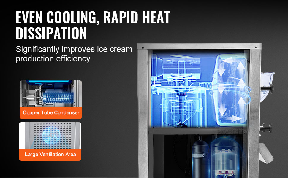 Equipped with a high-speed rotating mechanism and an effective cooling system, including a built-in copper tube condenser and large area side vents. This design ensures even cooling and heat dissipation, promoting consistent ice cream texture and firmness.