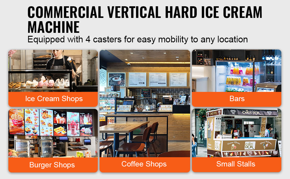 Ideal for a variety of commercial venues including ice cream shops, cafes, burger joints, drink bars, and small food stalls. The ice cream maker machine hard serve's compact size and efficient output make it a valuable addition to any food service establishment.