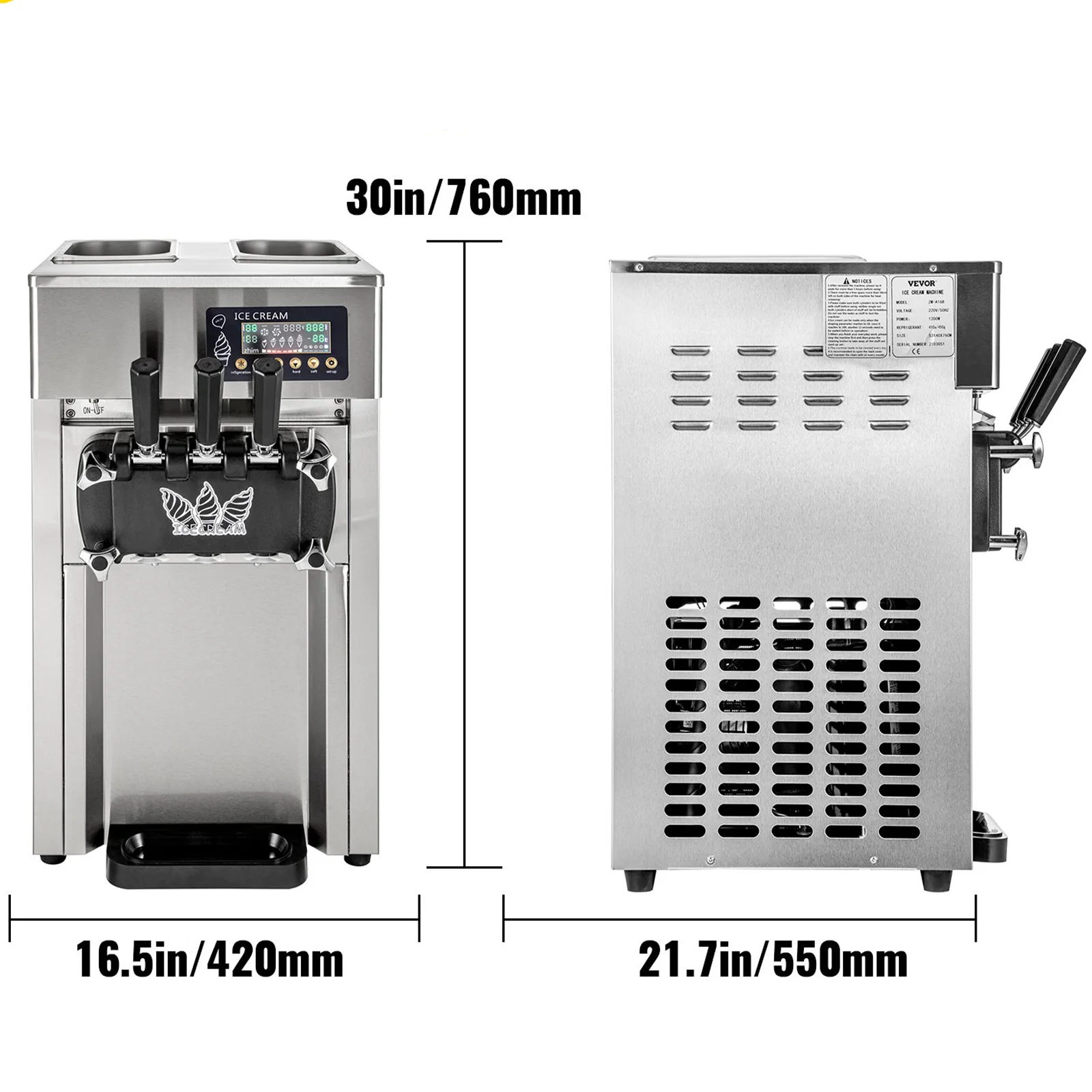 Made of stainless steel, our commercial ice cream machine is simple to clean and built to last. 2 hoppers (0.8 Gal each) ensure high production of 5 Gal/H. This professional ice cream maker is perfect for cold drink chains, bars, catering industries, etc.
