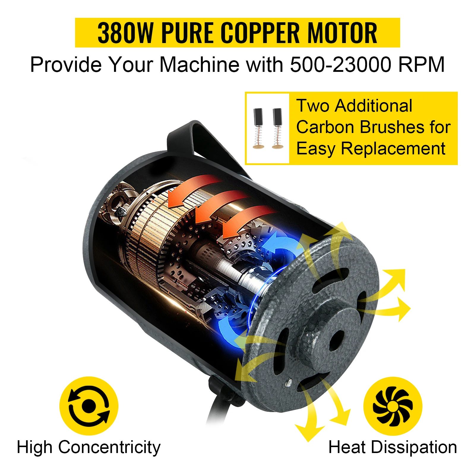 Pure Copper Motor: The 380/560/780W pure copper motor provides a wide speed range of 500-25000 RPM(EU/AU), 500-23000 RPM(US) for the flex shaft grinder with high stability and precision for elaborate work. It comes with a heat vent to keep the machine from overheating & burning to prolong its service life.
