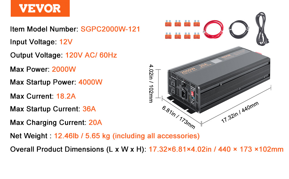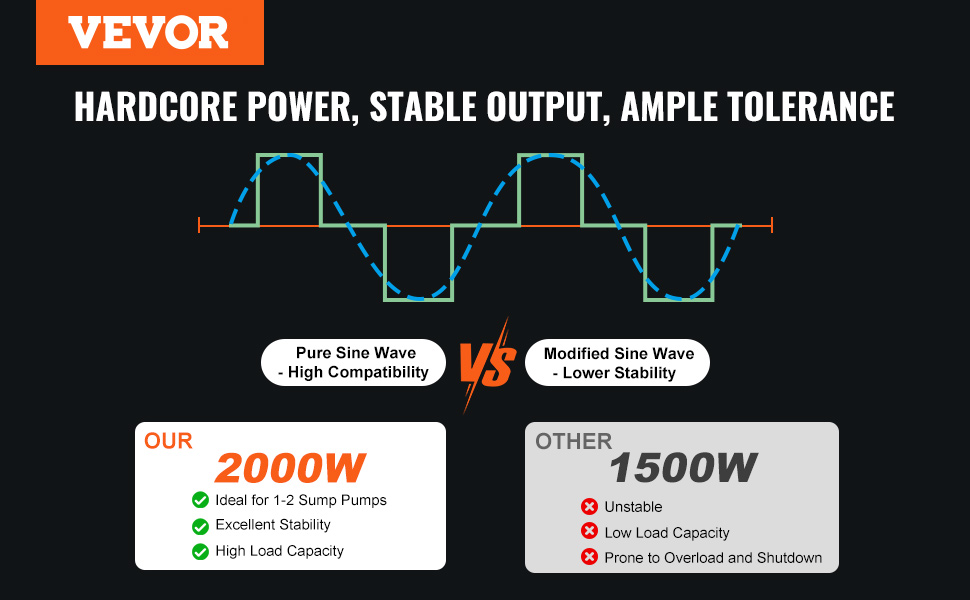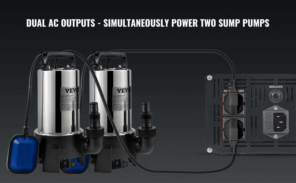 2000W Rated Power——The VEVOR sump pump battery backup inverter features a robust 2000W output, 18.2A operating current, and dual outlets, ready to support two sump pumps at once.