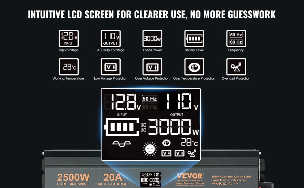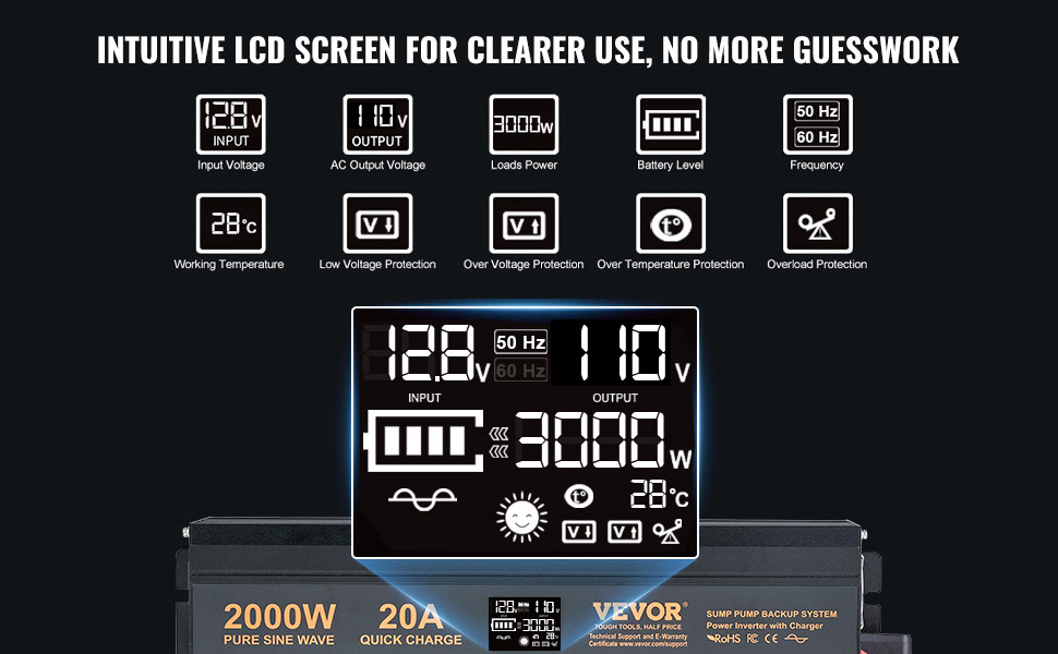 【Real-Time Display】: Stay informed and in control with the VEVOR sump pump battery backup system's real-time display feature! With a cutting-edge high-definition LCD screen and LED indicator lights, you can instantly monitor vital information such as voltage, power, battery level, and more. Enjoy confident and informed decision-making every step of the way!