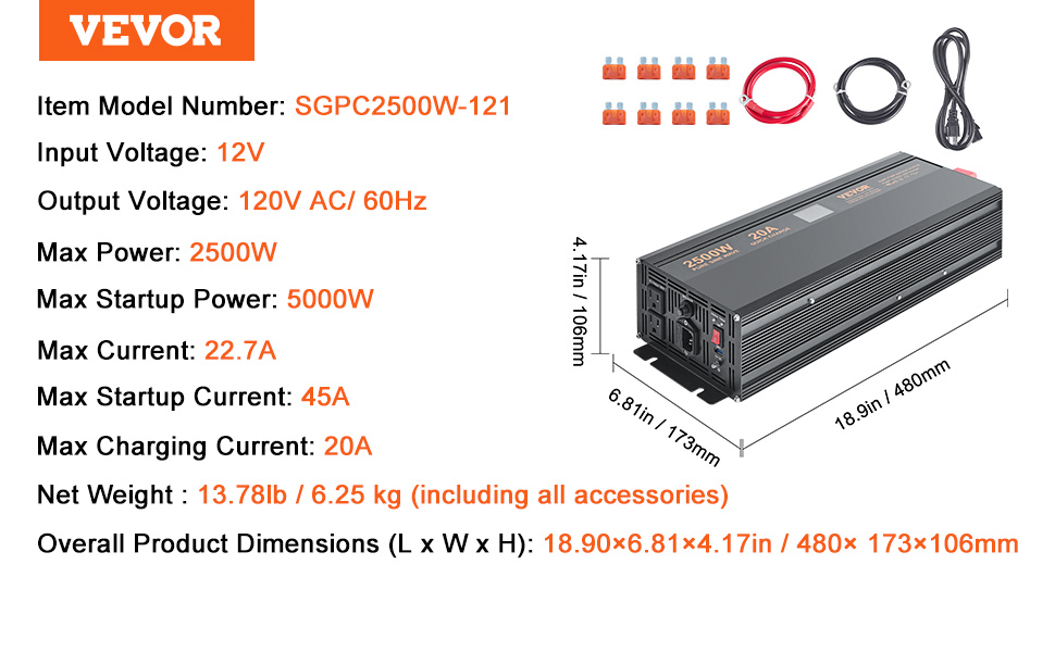2500W Rated Power——The VEVOR sump pump battery backup inverter features a robust 2500W output, 22.7A operating current, and dual outlets, ready to support two sump pumps at once.