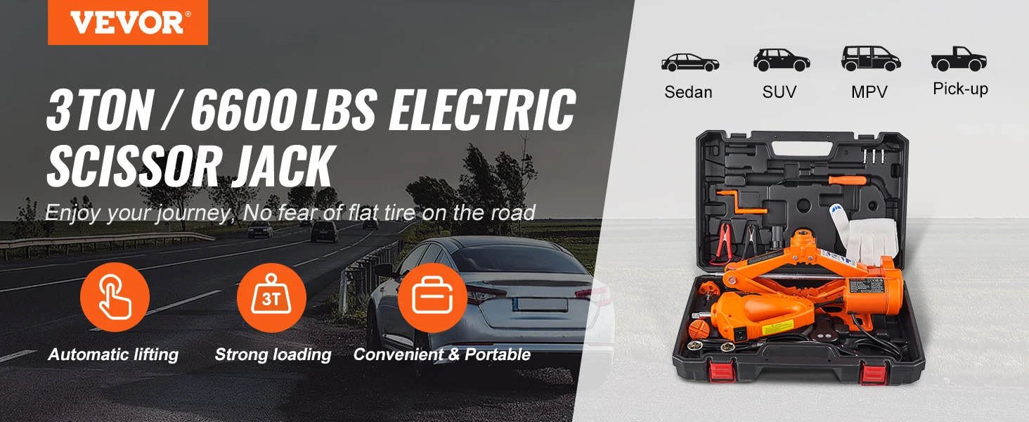 • Electric Scissor Jack Kit: Max. Capacity: 3.0 tons/6600 lbs. Lifting Range(short lifting head): 5.1''-14.6"/130-370 mm. Lifting Range (long lifting head): 6.7''-16.5"/170-420 mm. This electric car jack kit is a lifesaver during roadside emergencies and can be used for at-home garage repairs. It is suitable for sedans, SUVs, vans, or any vehicle that suits its capacity.