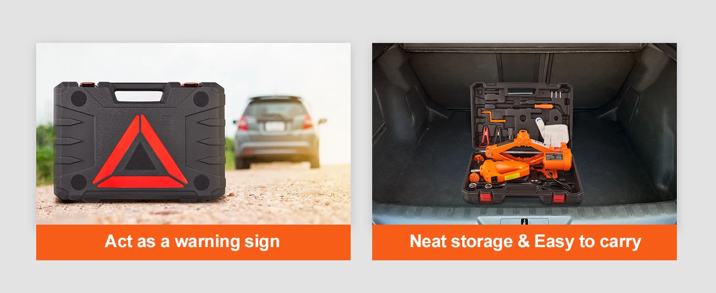 • Multi-Function Carrying Case: Everything you need to get started is provided and well organized in the toolbox. VEVOR's electric jack kit includes an electric car jack, 2 pcs saddles, 3 pcs spare fuses, gloves, a battery clip, a cigarette lighter power cable, and a tough case. Additionally, a luminous red triangle on the box's exterior can be used as a warning sign when changing tires on the roadside.