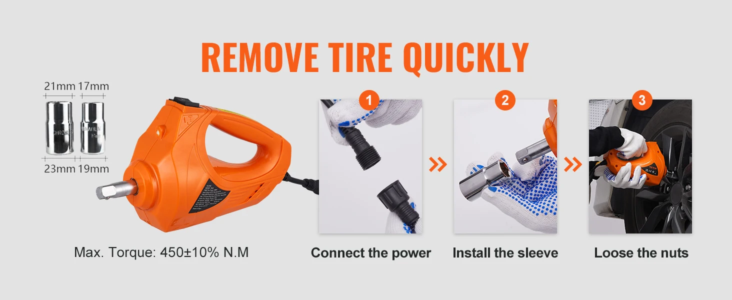 • High-efficiency Impact Wrench: With Max. Torque 450 N. M, the electric impact wrench can screw/unscrew in just a few seconds. 2 pcs sleeves are available for screws of 4 sizes (17/19 mm & 21/23 mm), matching more vehicles of various sizes of lug nuts in the market. Please select the right sleeve, and hold the power button until the screw is pulled out. It's as simple as that!