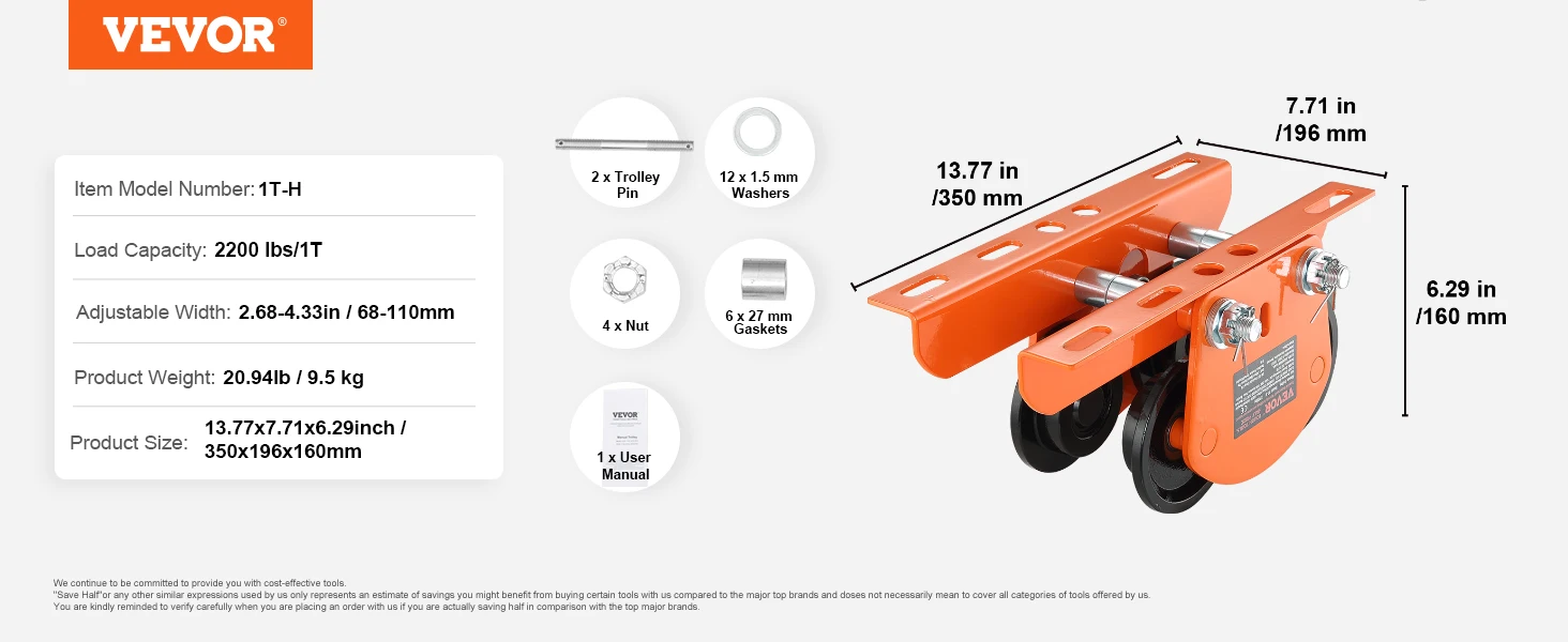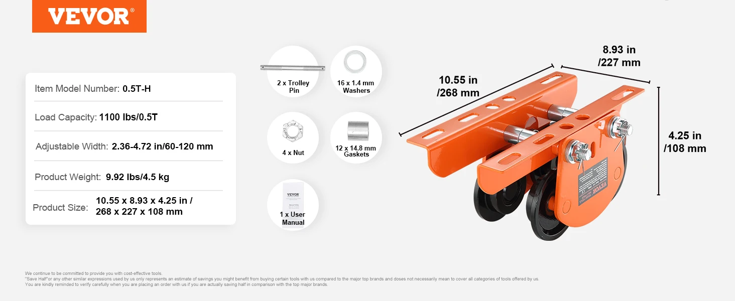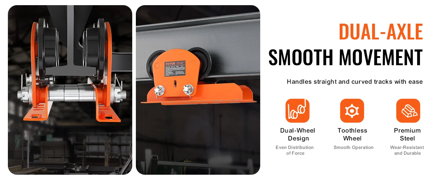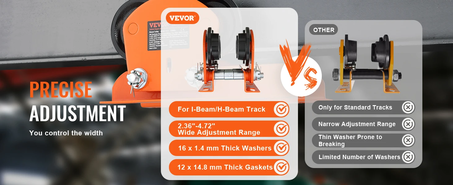 Forget the ordinary trolleys! VEVOR's push beam trolley comes with extra-thick washers, expanding its fit for different beams. Adjusting is quick, easy, and, let's face it, pretty satisfying.