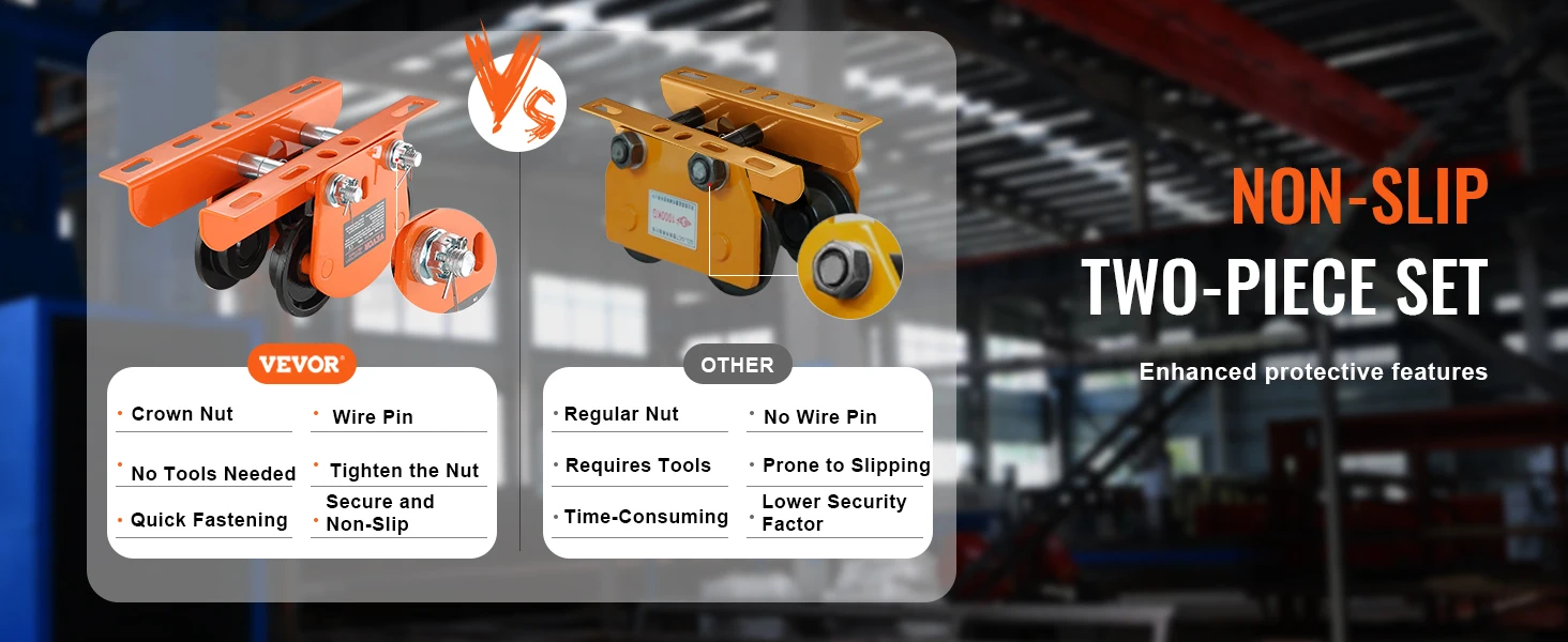 VEVOR beam trolley hoist adds a touch of extra security with the crown nut and wire pin. The crown nut can be quickly tightened without tools, and the wire pin locks securely in place, providing double the security.